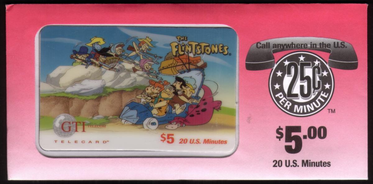 At the top of the card, text reads "$5" indicating the value of the card. The card also displays the title "Flintstones Cartoons: Hatfields & McCoys Shooting," which references a specific episode or theme related to the Flintstones series. The branding includes GTI Telecom, Inc., identifying the telecommunication company associated with the issuance of this phone card.