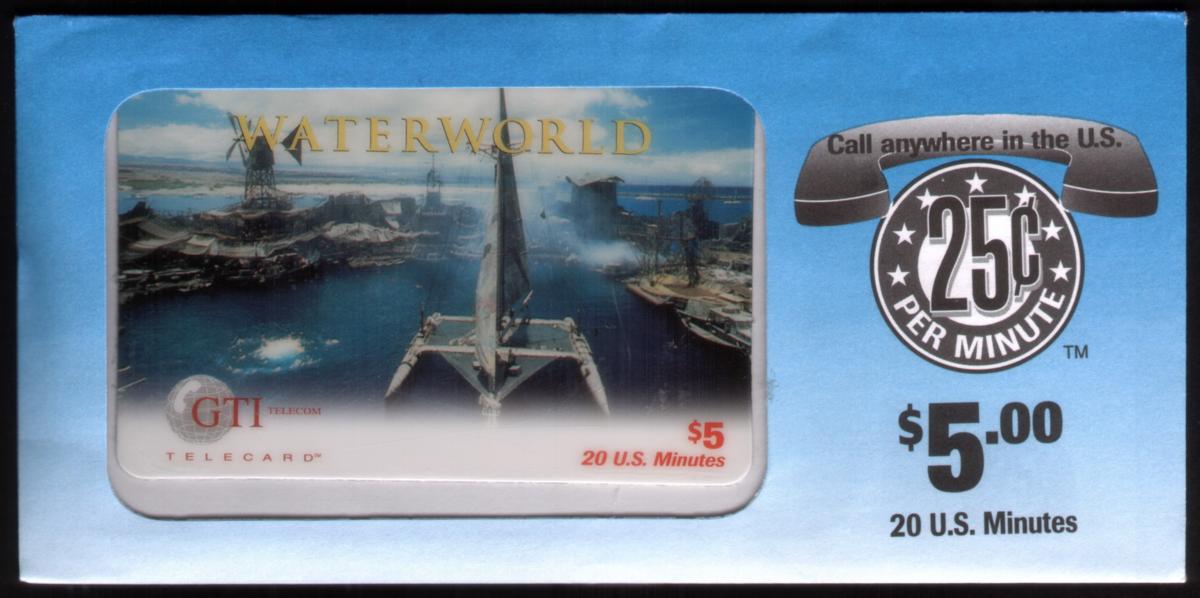 Produced by GTI Telecom, Inc., this phone card is sealed and intended as a collectible. The combination of the Waterworld movie reference, the trimaran boat, and the reef imagery ties directly to the film's aquatic adventure and environment. The card is a legitimate collectible within entertainment and Hollywood memorabilia.