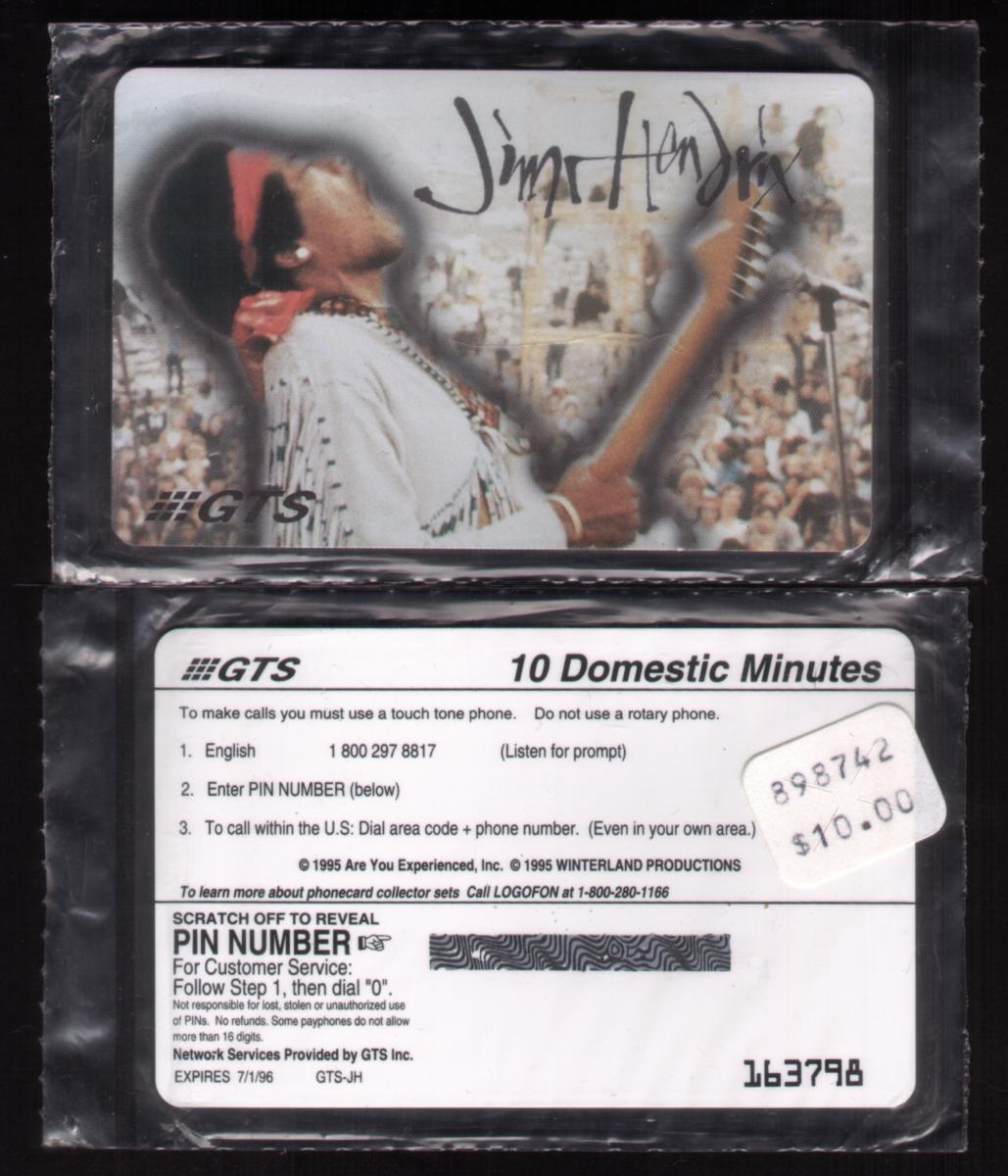 The card’s layout includes a clean background that puts full attention on Hendrix and his guitar. The branding by Global Tel. Solutions appears clearly on the front, aligning with the collectible nature of the card. This piece serves as a tribute to Jimi Hendrix’s musical legacy while functioning as a collectible phone card with a designated value.