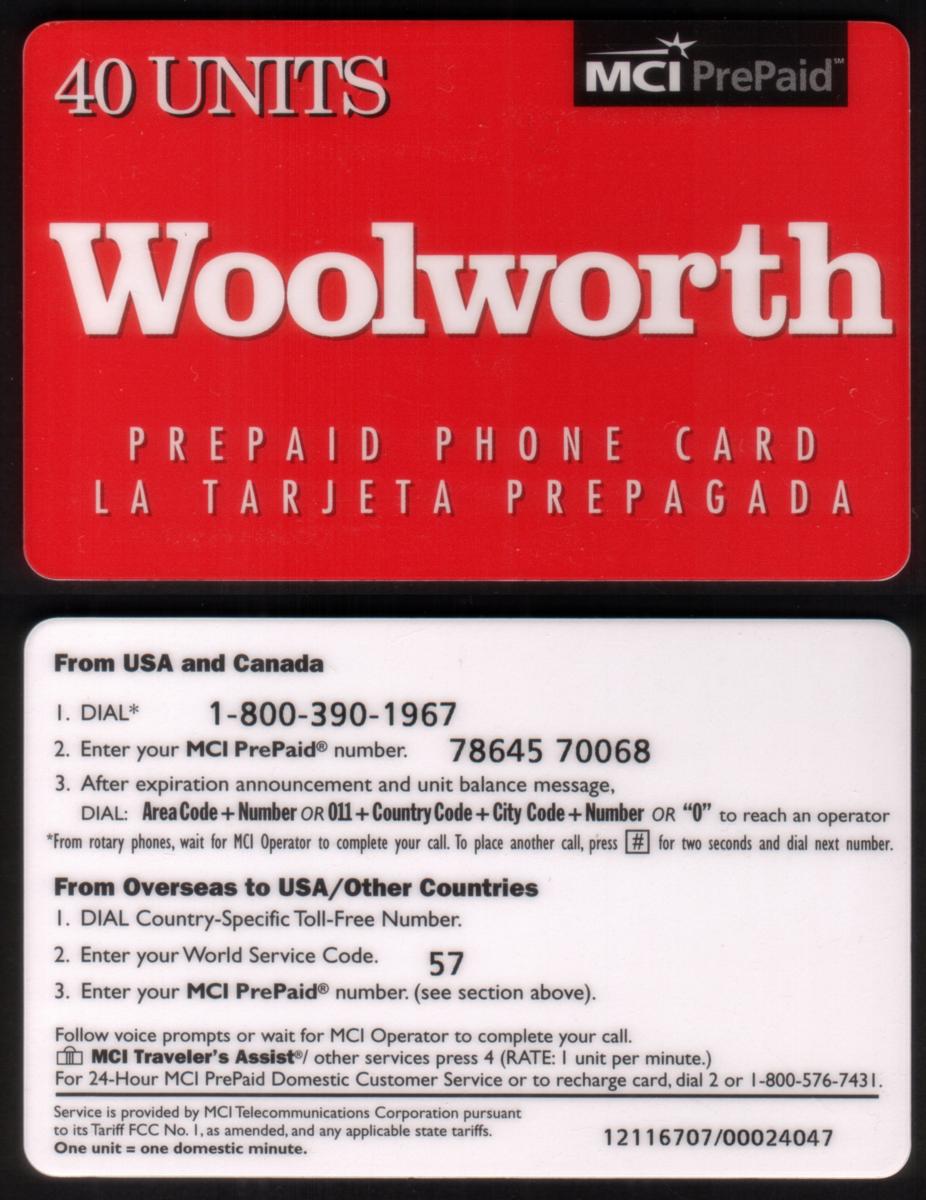 Overall, this phone card represents a collectible item linked to the Woolworth’s department store chain and MCI Communications telephony services, reflecting a specific era of prepaid calling technology and retail partnerships.