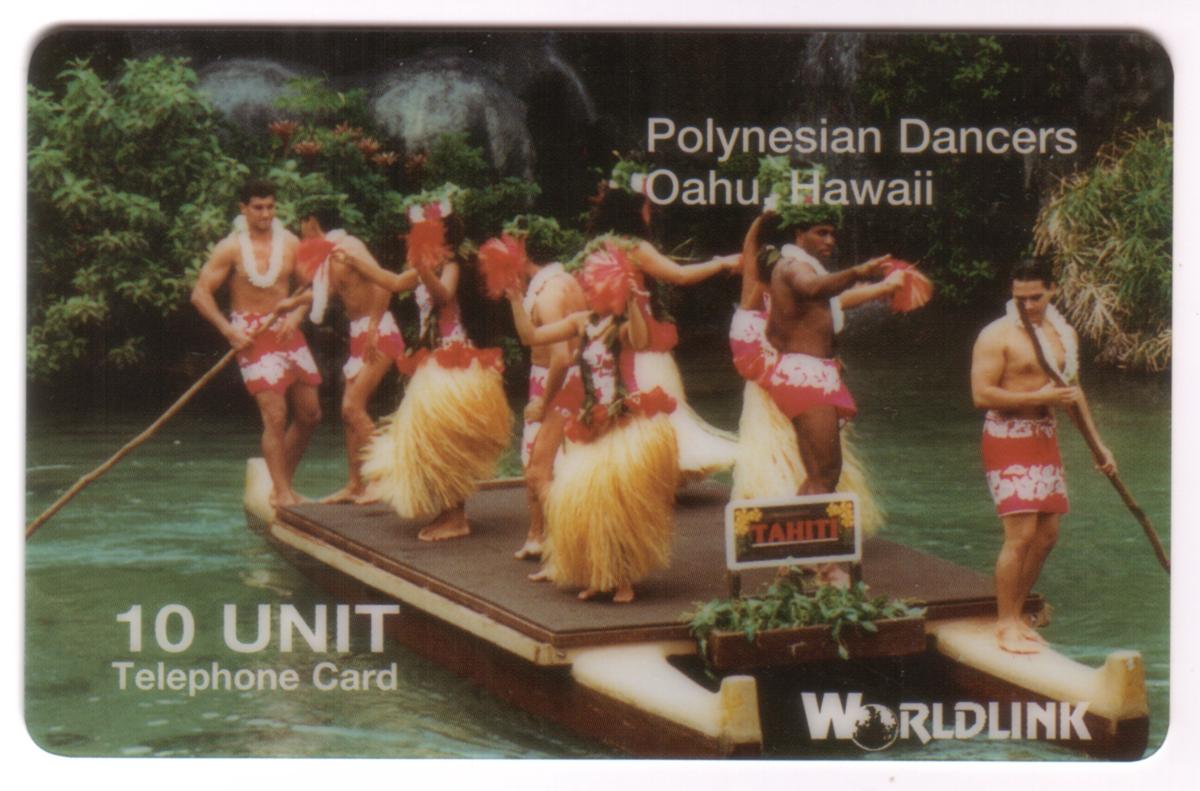 The card displays the text "Polynesian Dancers Oahu, Hawaii" prominently at the top right. At the bottom left, it indicates the card’s value as "10 UNIT Telephone Card." The bottom right corner includes the WorldLink logo in white. There is a small rectangular label on the raft marked "TAHITI," which adds a distinct cultural reference within the image.