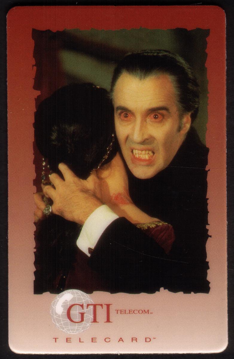 The fourth card features a vibrant classic movie poster for Hammer's "Dracula," starring Peter Cushing and Christopher Lee. The poster includes the text "The Terrifying Lover who died - yet lived!" along with the famous vampire imagery of Christopher Lee about to bite a woman. The GTI Telecom globe logo and “TELECARD” text are printed to the right of the image.