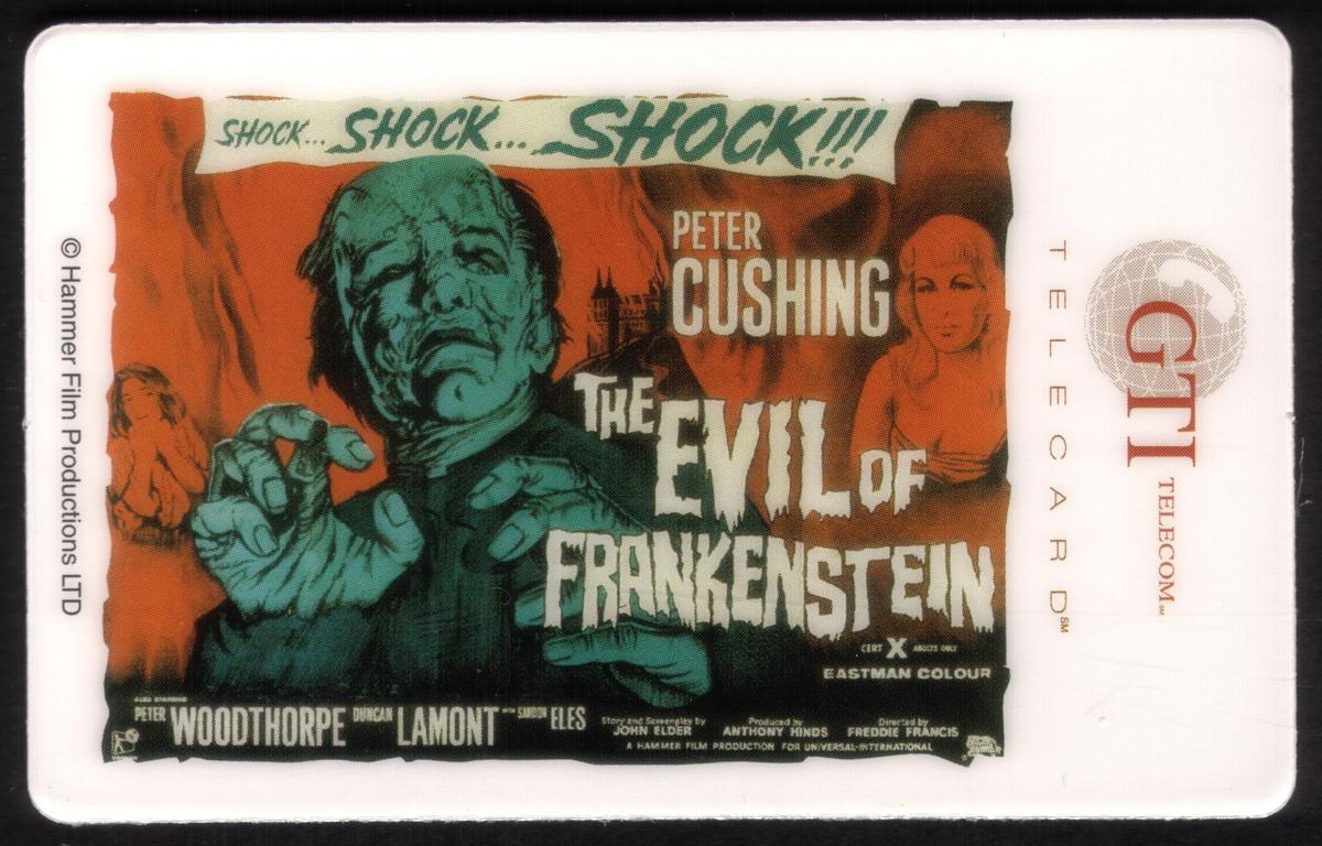 The fifth card displays a poster for “The Evil of Frankenstein,” starring Peter Cushing, with a dramatic illustration of the Frankenstein monster in green and black against an orange background. The poster includes additional cast names such as Peter Woodthorpe and Donald Sutherland, and Hammer Film Productions LTD is credited. The card bears the GTI Telecom logo and "TELECARD" at the right.