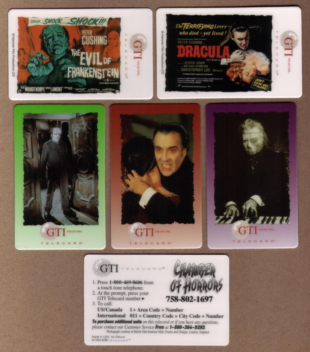 Together, these five GTI Telecom phone cards form a collectible set celebrating landmark British horror films produced by Hammer Film Productions, featuring well-known actors Christopher Lee and Peter Cushing and their classic monster portrayals.