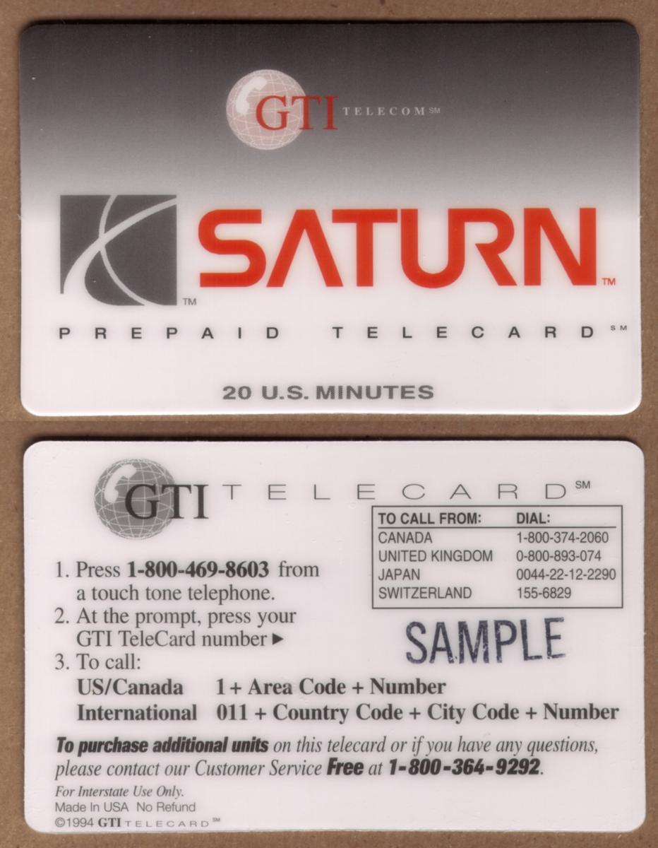 Overall, the card combines automotive imagery with corporate logo design, representing the Saturn automobile brand in a city setting while highlighting its association with GTI Telecom, Inc. The visual elements and text are clear and professionally rendered in blue, white, and dark color tones.