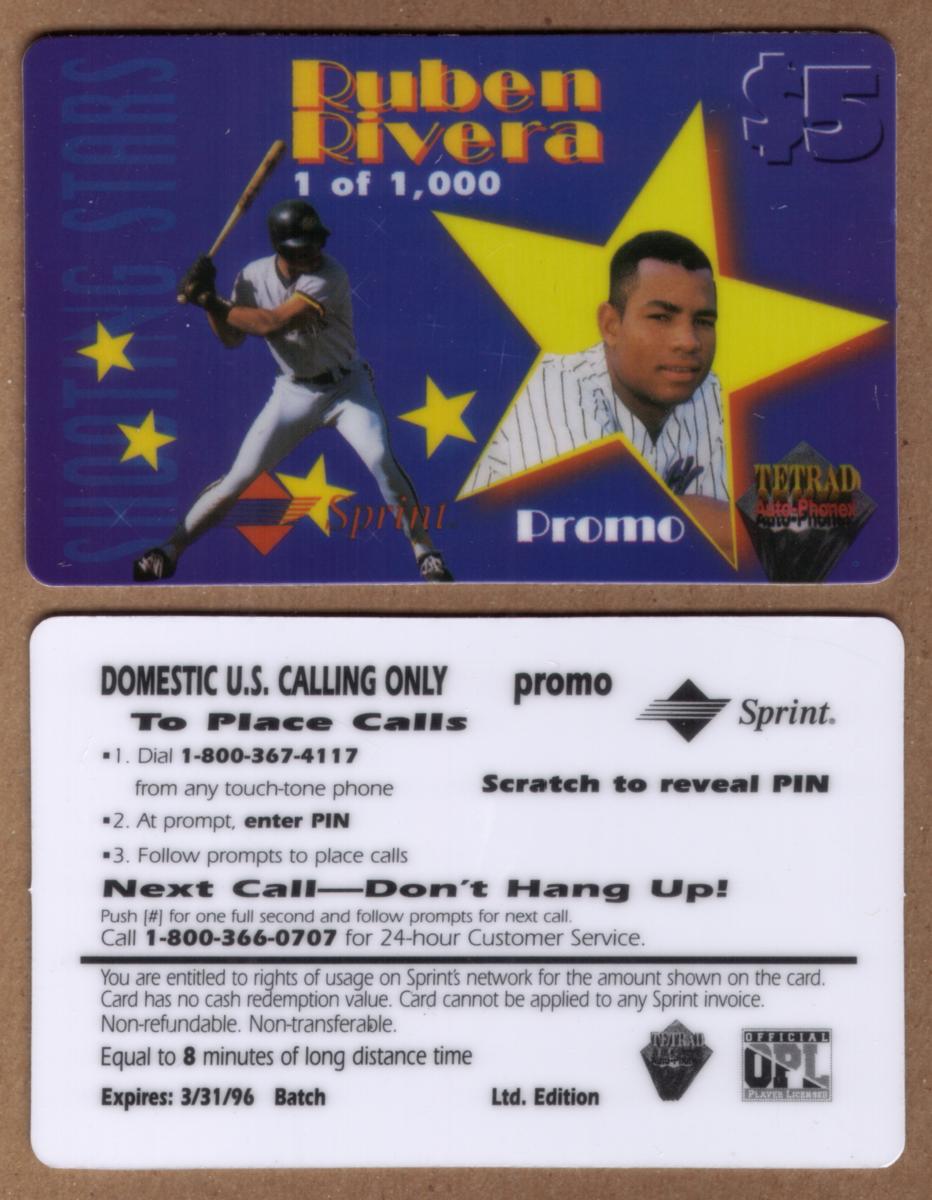 Overall, this $5 baseball collectible card commemorates Ruben Rivera through the Auto-Phonex Tetrad Baseball series, with clear identification of the player’s name and associated sponsors. The card’s visual elements underline its connection to baseball and Sprint.