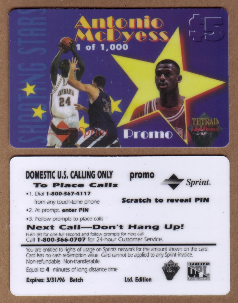 This collectible phone card features a basketball theme centered on Antonio McDyess. The card prominently displays an image of Antonio McDyess in action, wearing a basketball jersey, captured mid-play. The background is designed with dynamic graphics that evoke the fast-paced nature of basketball. The text "$5" is located on the card, indicating its value.