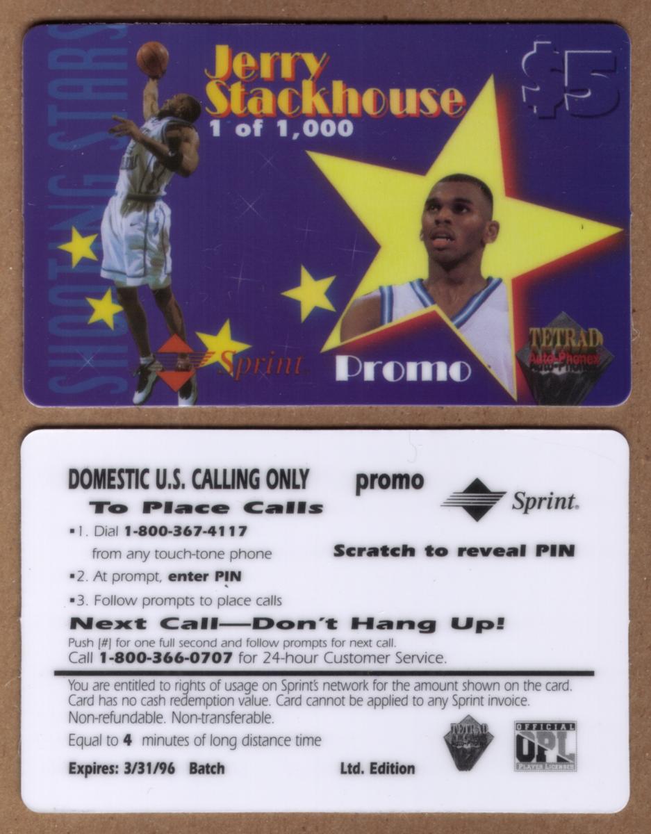 The overall look of the card is promotional, combining sports imagery with corporate branding from Sprint and WorldCom. The layout focuses on showcasing Jerry Stackhouse as the central figure, with all elements harmonized to highlight his basketball career within a collectible $5 card format.