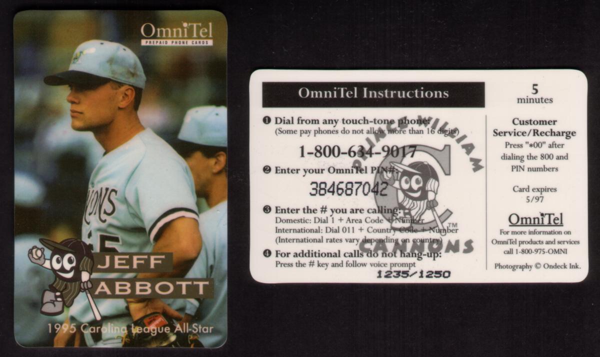 The overall design uses blue and white tones, complemented by the natural wood color of the baseball bats. The card’s presentation honors both the sport of baseball and the Carolina League’s all-star representation, centered specifically on Jeff Abbott and the Prince William Cannons team.