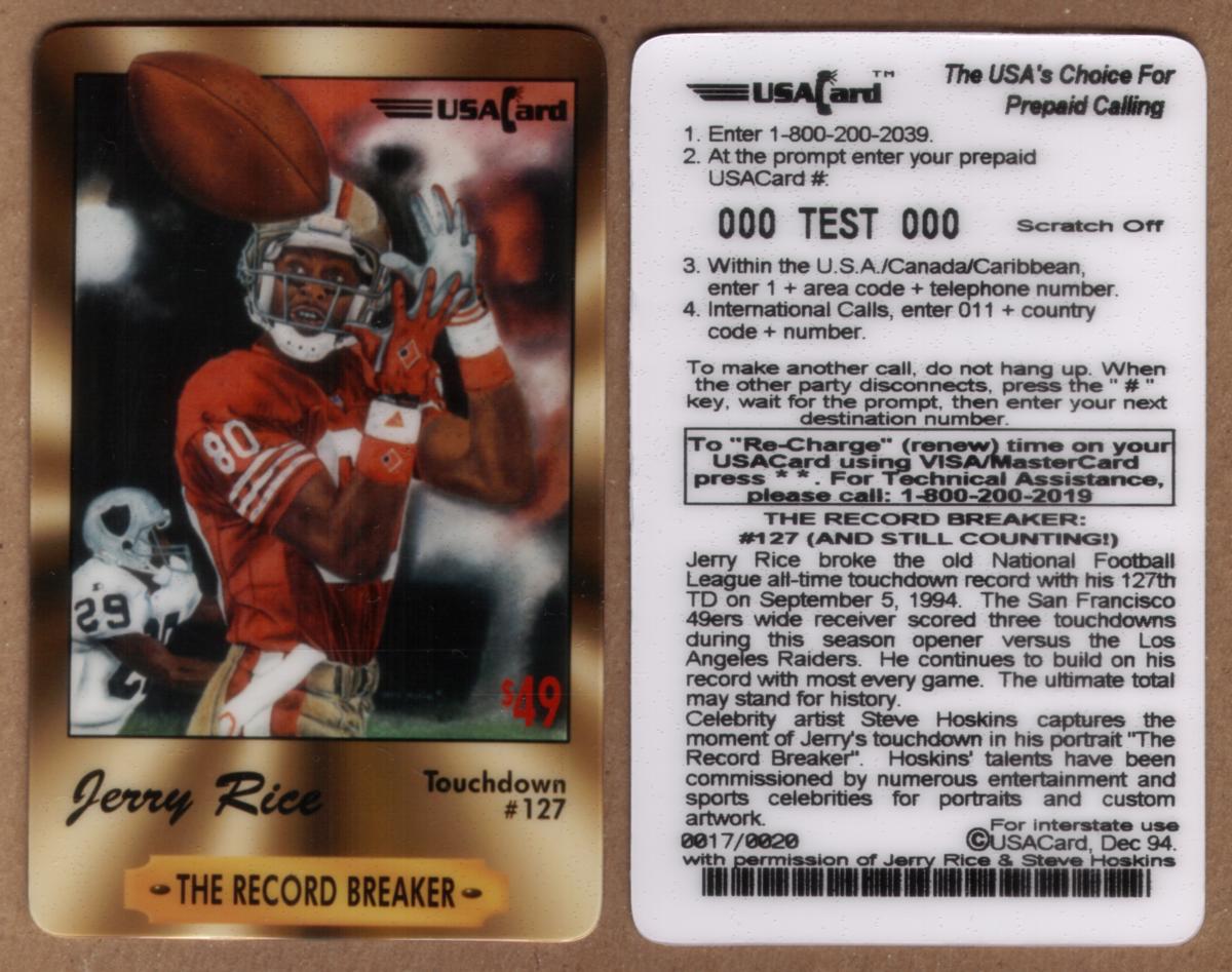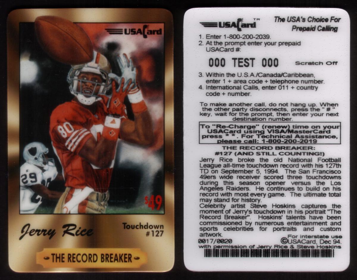 This collectible card commemorates Jerry Rice, renowned NFL football player for the San Francisco 49ers, highlighting his achievement of scoring touchdown number 127. The card features the title "The Record Breaker" prominently, along with the date September 5, 1994. The imagery includes a photographic representation of Jerry Rice in football gear associated with the 49ers, emphasizing his record-setting career in the National Football League.