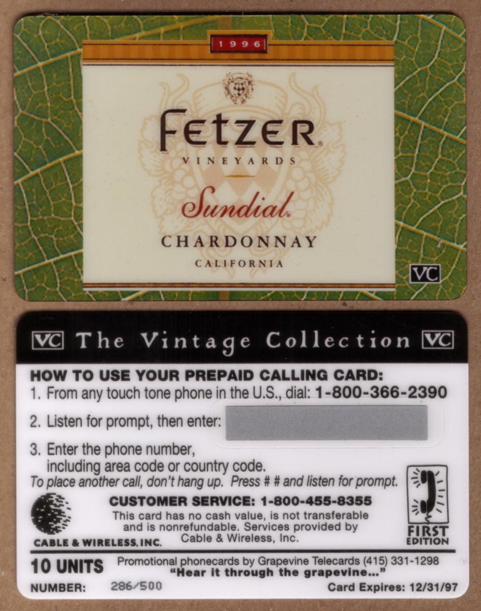 The card’s design reflects its promotional nature associated with the California wine industry, specifically focusing on the Fetzer Vineyards brand and its 1996 Sundial Chardonnay vintage. The image and text combine to highlight both the product and its role as a collectible phone card issued by Grapevine Telecards.