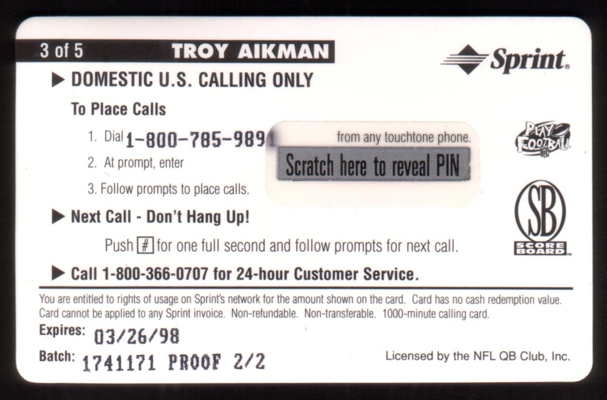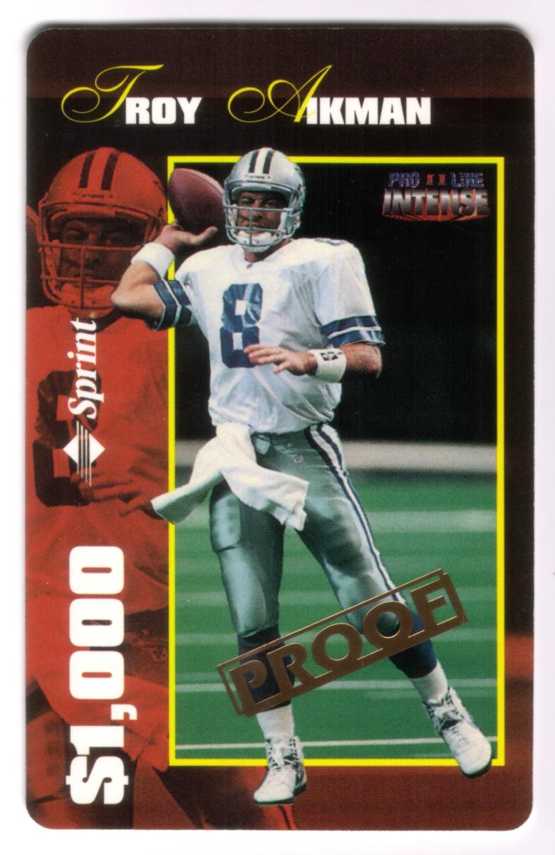 The card includes the text “Troy Aikman” at the top in stylized yellow and white letters. Along the left side is the Sprint logo in white. At the bottom left corner, the value “$1,000” is displayed in bold white numbers. The word “PROOF” is stamped diagonally in large brown letters across the bottom center of the card’s main photo. Near the top right corner, there is a logo reading “PRO LINE INTENSE.”
