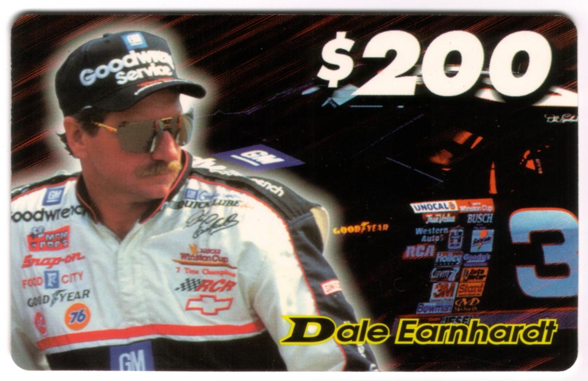 The card contains a prominent "$200" value displayed in large white text at the top right corner. Dale Earnhardt’s name is printed at the bottom in yellow and black lettering. This card is identified as the Dale Earnhardt Special 1997 Wrapper Redemption Promo from The Score Board Inc. It is linked to auto racing and NASCAR memorabilia, emphasizing sponsors such as Goodwrench, Snap-on, GM, and Unocal 76.