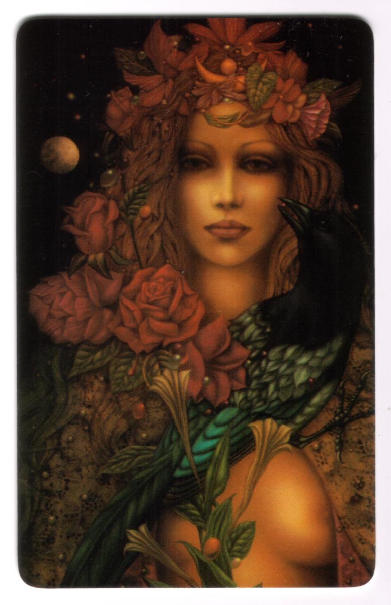 The card also carries the name "Telephone Express" and the logo "PATCO," indicating the issuing entities associated with it. The denomination of the card is 10 units, clearly displayed on the front. The overall presentation blends vivid colors with a harmonious balance between the figure and the background, emphasizing the goddess's role as a symbol of the soul within the artistic genre.