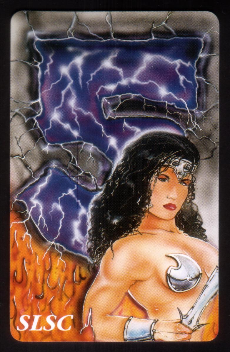 In the background, a large, stylized letter "S" is prominently displayed. The letter is depicted with a cracked stone texture and is illuminated by purple and white lightning bolts. Beneath the letter "S," flames rise, adding a fiery element to the composition. At the bottom left corner of the card, the initials "SLSC" appear in white lettering.