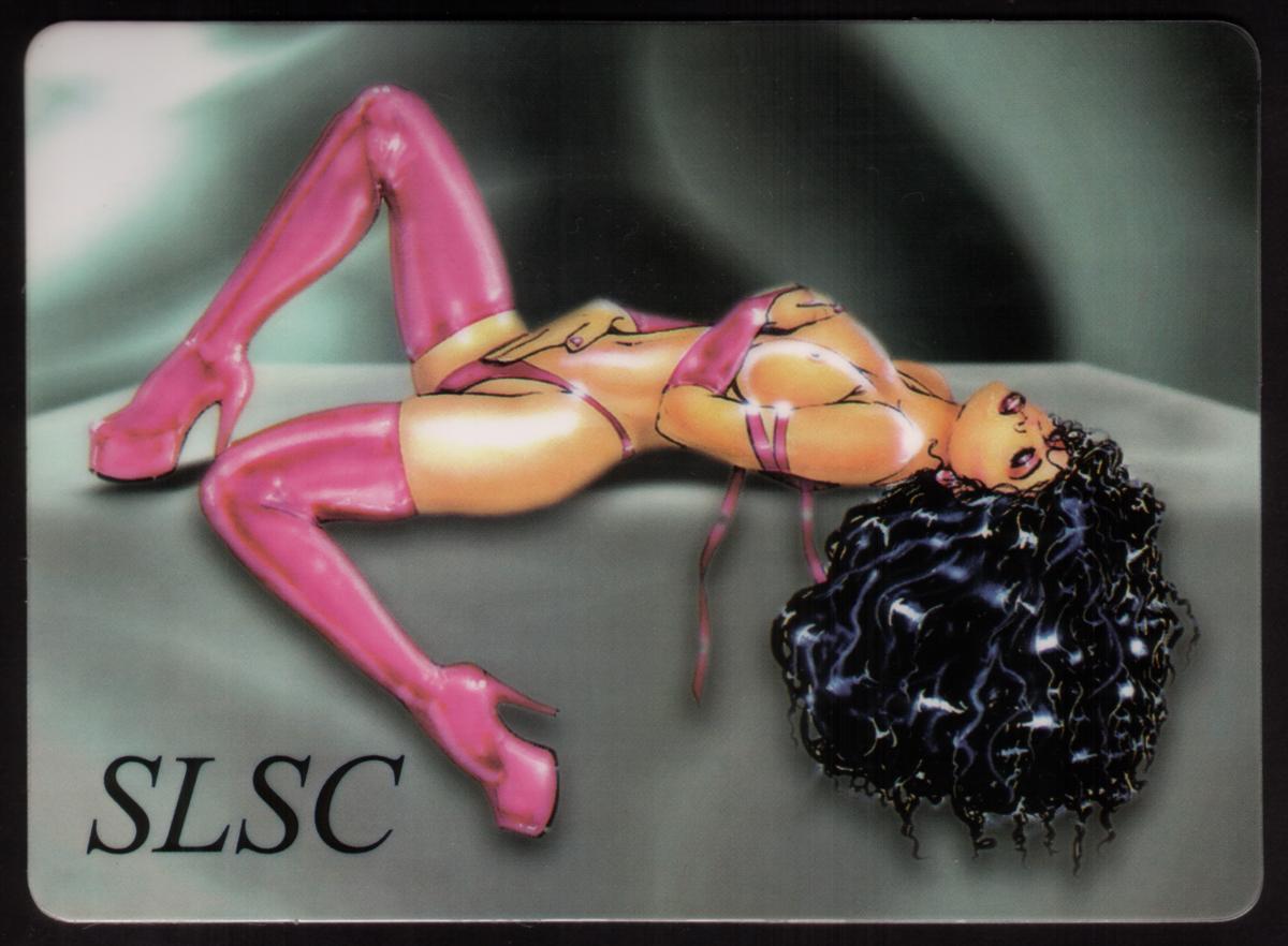 The card's background includes smooth gradients of gray and green, which provide a subtle contrast to the figure's vivid outfit and skin tone. The letters "SLSC" appear in the lower left corner of the card in black text.