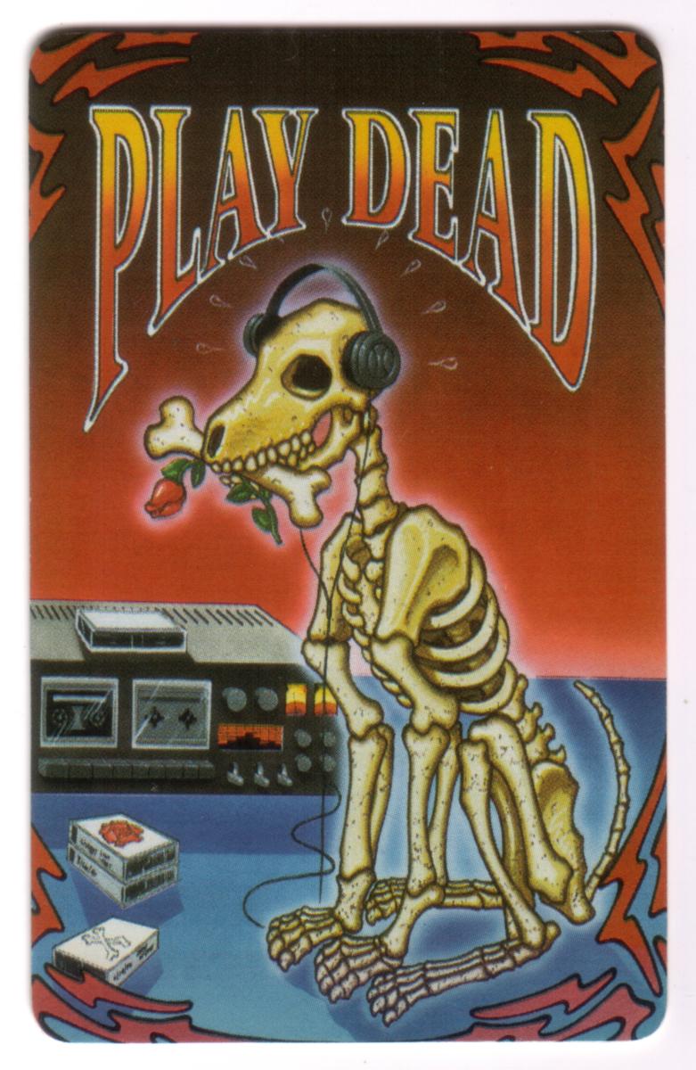 This collectible phone card features vibrant artwork by Gary Kroman inspired by the Grateful Dead, an iconic rock band. The central image showcases a dog skeleton adorned with roses and dog bones, embodying the distinctive artistic style linked to the band’s imagery. A pair of headphones and a cassette tape player are integrated into the design, reinforcing the music theme and nostalgic connection to the era of cassette tapes.