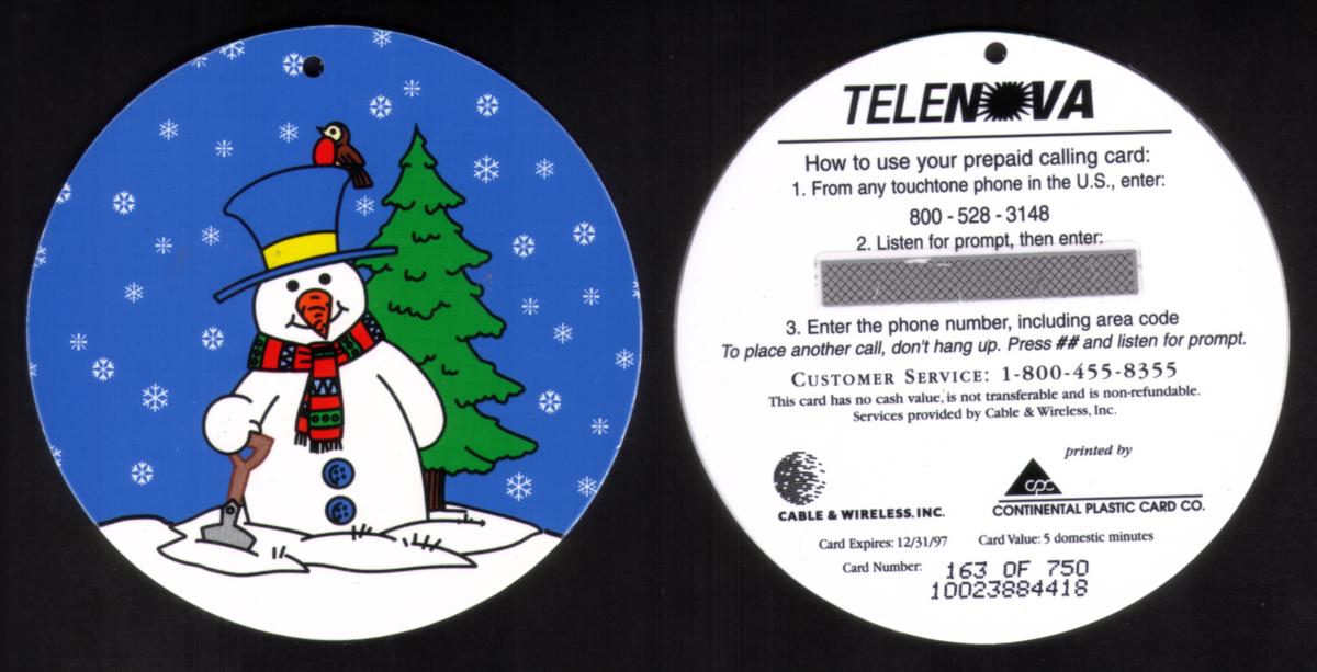This collectible clearly celebrates the Christmas holiday season and is marked by festive imagery with traditional winter holiday symbols. The inclusion of the Cable & Wireless and Telenova logos confirms its connection to telecommunications, while the 5m marking specifies its value metric. The die-cut design makes this card visually unique and a desirable item for collectors interested in holiday-themed phone cards.