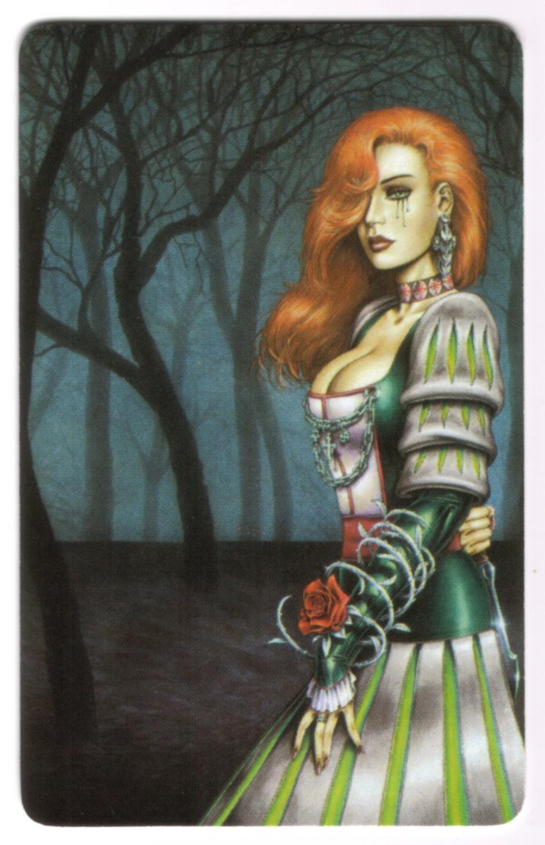 This collectible phone card features a fantasy art illustration by Joseph Michael Linsner. The artwork depicts a striking woman with long, flowing red hair standing in a dark, misty forest with barren trees. She wears a detailed, elaborate outfit with shades of green, silver, and white, featuring shoulder armor and a corset-style bodice. Her right hand holds a single red rose, which stands out vividly against the muted forest background.