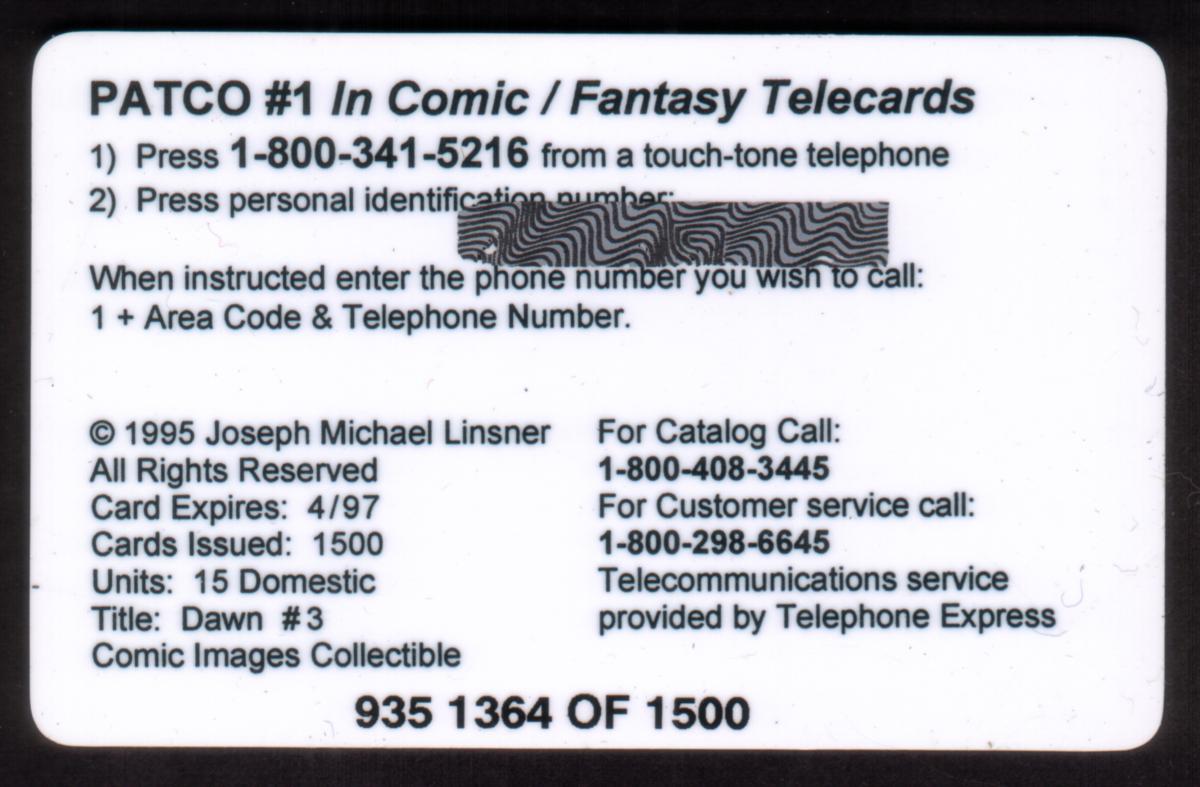 The phone card is issued by PATCO and is associated with the Telephone Express series. The card’s design combines fantasy elements and comic book style, typical of Joseph Michael Linsner’s artwork, specifically from the Dawn series. The card’s elegant and slightly gothic aesthetic makes it a collectible item for fans of fantasy art and comics.