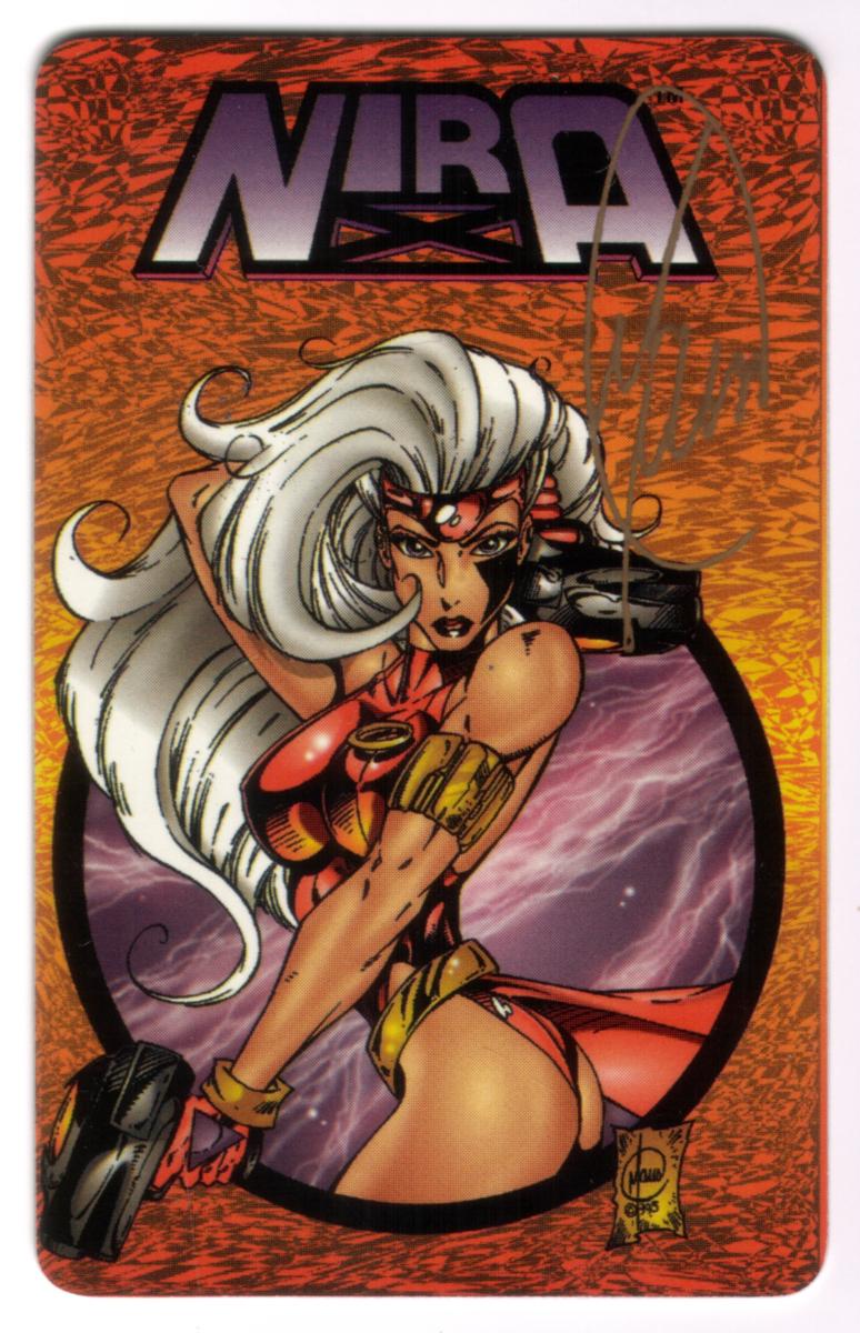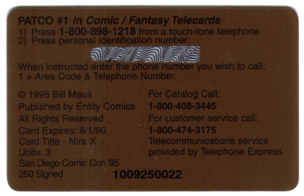 The top of the card displays the bold "NIRA X" logo in stylized silver and black lettering. The lower right corner includes the Entity Comics logo, confirming the card’s connection to the publisher. This card is signed artwork by Bill Maus and relates to Telephone Express, specifically marking San Diego Comic Con 1995, making it a collectible from Comic Con 1995.