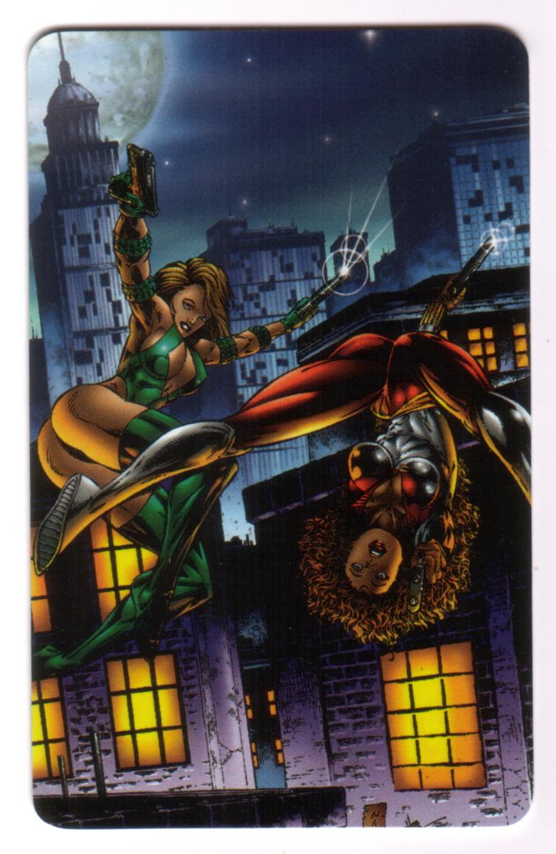 This collectible phone card features vibrant fantasy comic art by Marat Mychaels, associated with the Law & Order Comic Artwork series. The illustration depicts two female superheroes in dynamic action poses against a nighttime urban cityscape. One character wears a green and gold outfit with long gloves and boots, holding a rectangular device in her right hand as she swings forward. The other character, below her, is dressed in a form-fitting black and red costume with an afro hairstyle, upside down and seemingly in mid-air, suggesting a scene of agility and combat.