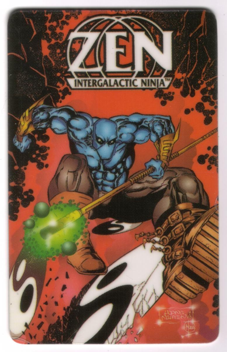 The background is fiery red with black abstract ink splatter designs that intensify the dramatic action scene. At the top of the card, the prominent logo reads “ZEN” in bold white letters with “INTERGALACTIC NINJA” directly beneath it in smaller black text. The entire composition amplifies the thematic blend of science fiction and martial arts within the comic’s narrative universe.
