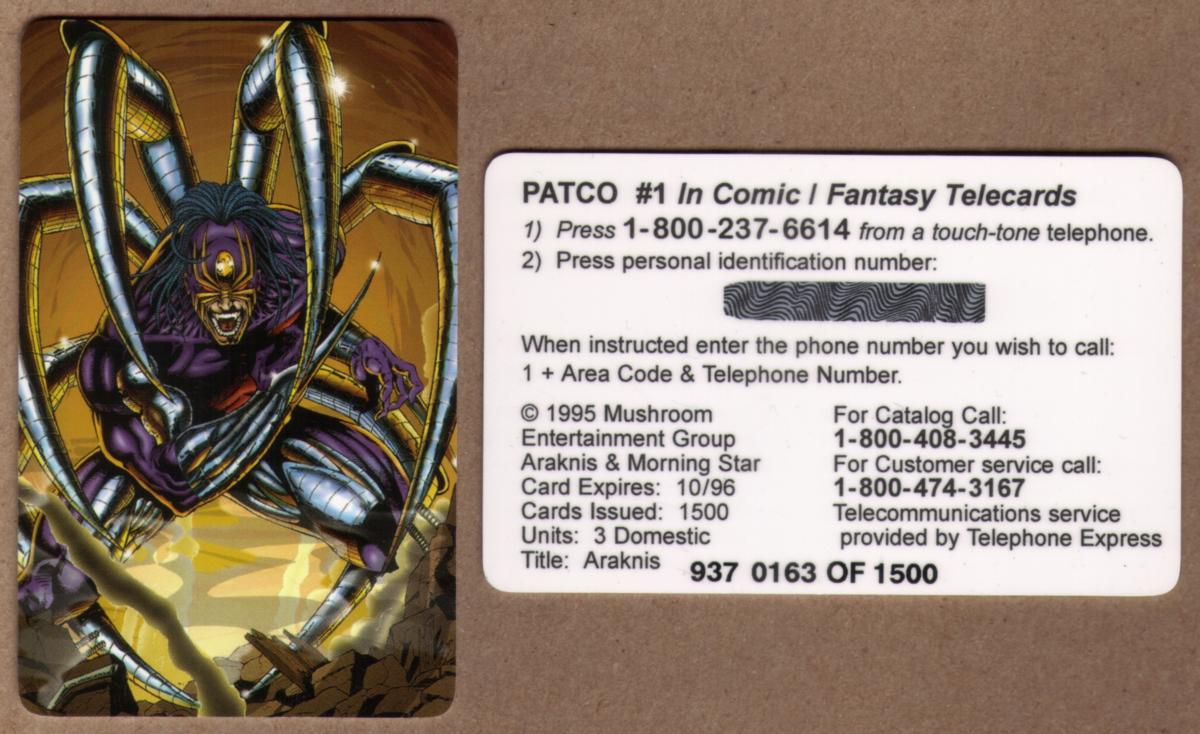 This collectible phone card features fantasy artwork titled "Araknis Spider Fantasy Artwork," created by Morning Star for the Mushroom Entertainment Group. The central image vividly presents a large, intricately detailed spider named Araknis, rendered in a stylized, comic art form with vibrant colors and dynamic shading. The spider’s appearance is designed to evoke a mythical or otherworldly feeling, consistent with fantasy art themes. The card includes the logo of Telephone Express and displays the name "PATCO" prominently.