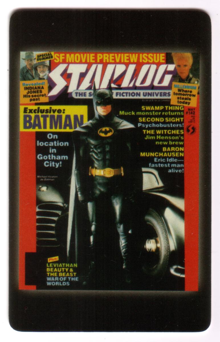 This collectible chip card features the cover of Starlog Magazine with a focus on Batman and the Batmobile. The image shows the Batman character standing in front of the Batmobile, clad in his classic black batsuit with a prominently displayed yellow and black Bat emblem on his chest and a yellow utility belt. The cover highlights an exclusive feature on Batman, mentioning "On location in Gotham City!" The Starlog magazine title is clearly visible at the top in bold white letters with red accents, accompanied by the text "SF Movie Preview Issue" in yellow.