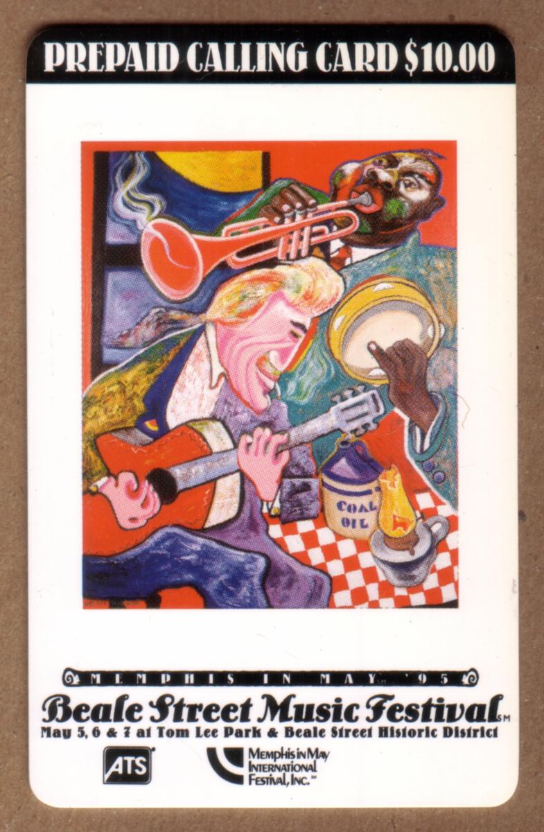 This card serves as a collectible item connected to the Memphis In May International Festival and the 1995 Beale Street Music Fest event. The card’s denomination is $10, and its presentation includes a colorful and artistic layout centered around musical themes tied to Memphis, Tennessee. The issuing entity listed is ATS Network Communications.