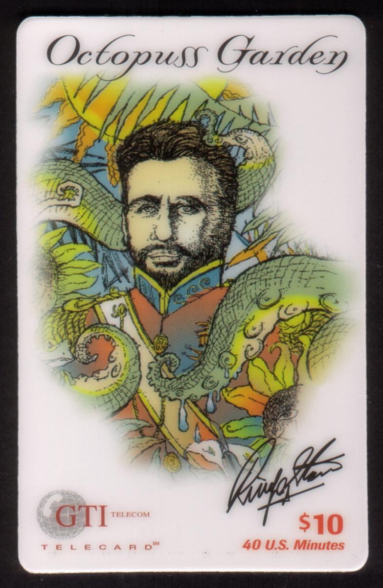 This collectible phone card reflects the cultural influence of The Beatles and their band member Ringo Starr, showcasing decorative and psychedelic-style artwork tied to the folk and rock music era of the 1960s. It combines musical celebrity imagery with thematic marine and colorful psychedelic designs.