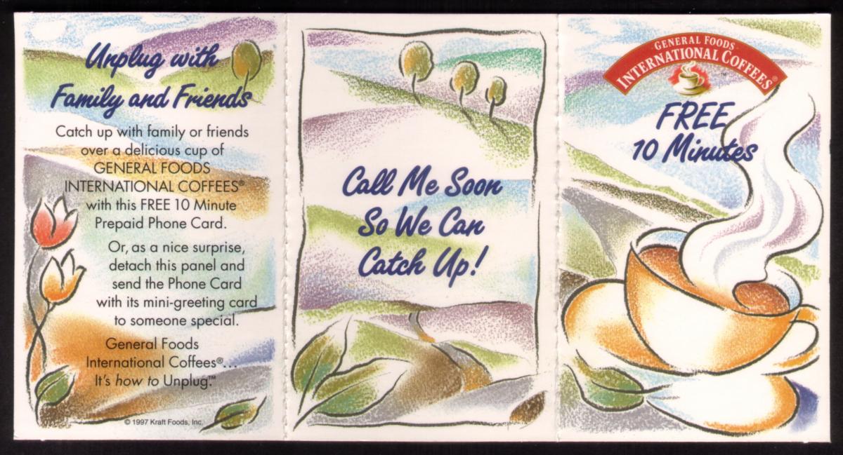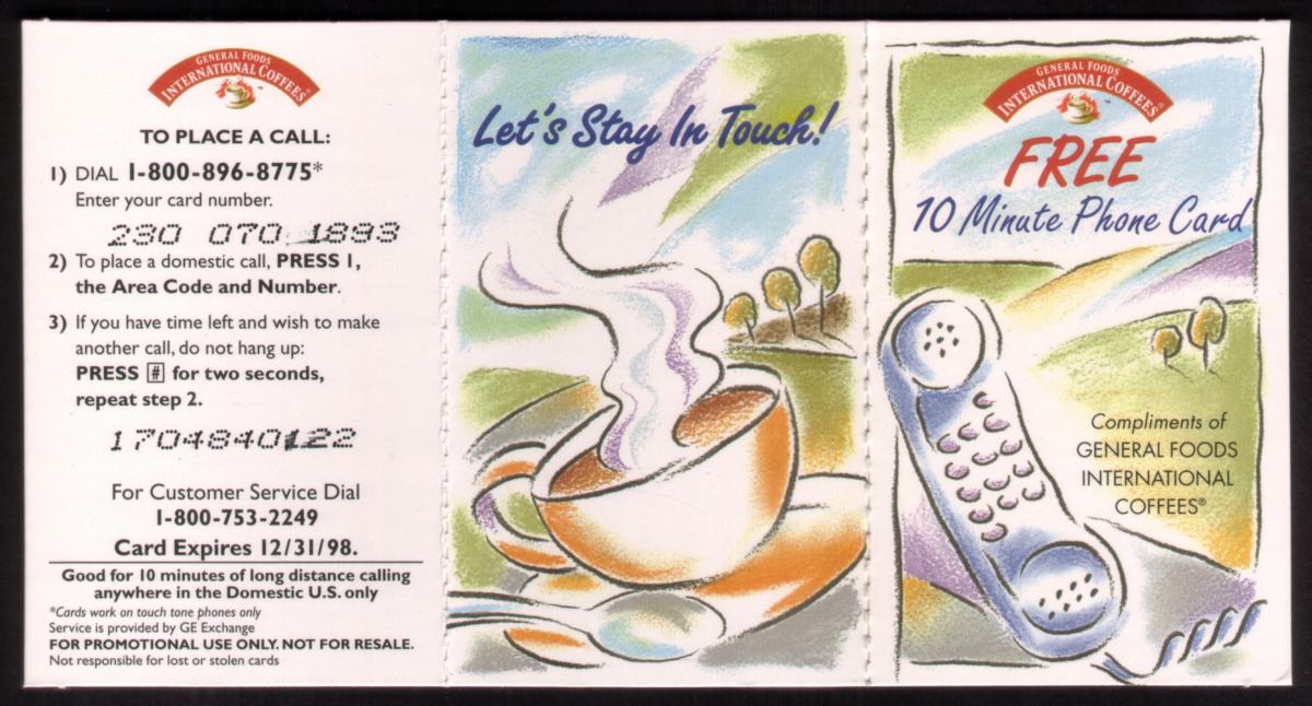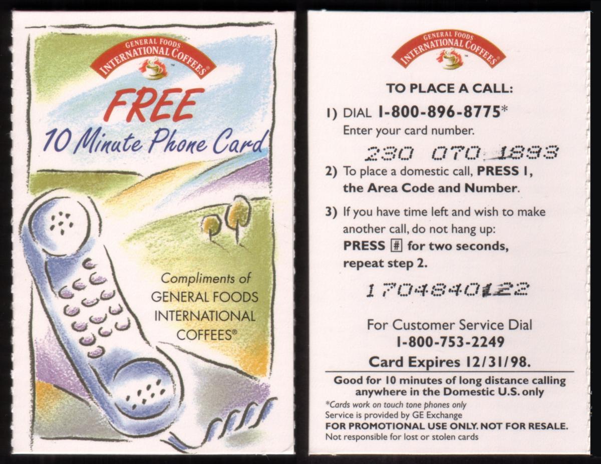 Overall, this phone card serves as a complimentary offering from General Foods International Coffees, combining artwork related to traditional telecommunications with clear instructions for use. It reflects a vintage style of phone cards before mobile and digital communication became widespread, emphasizing its collectible and promotional nature.