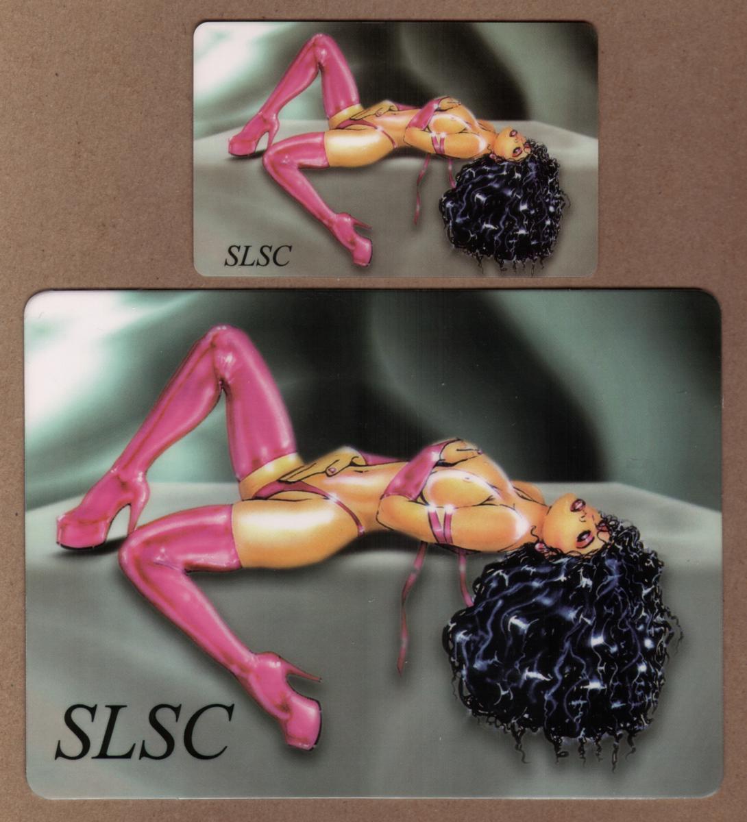 Overall, these cards are designed as collectible items, focusing on the visual appeal of the female figure dressed in elegant black satin attire. The identification details and the size difference between the two cards provide collectors with distinct variations within this set.