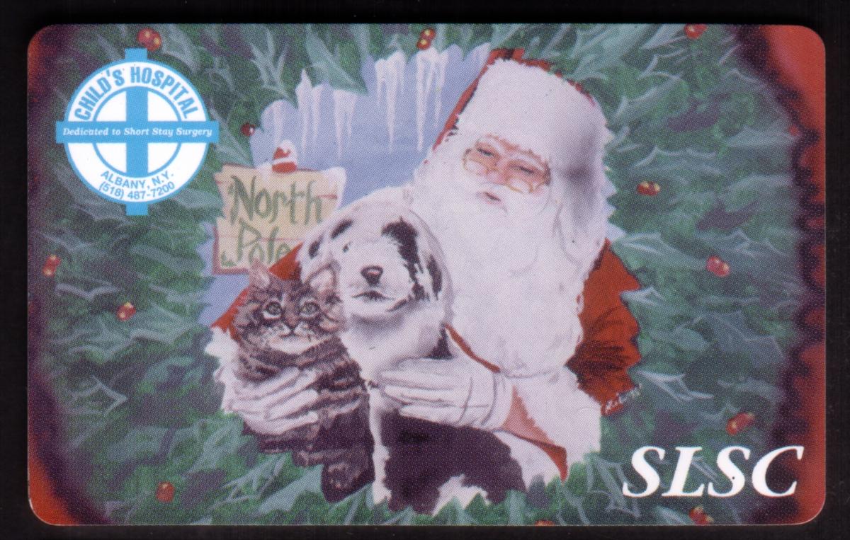This card is connected to the Child's Hospital in Albany, New York, specifically dedicated to short stay surgery. The presence of the cat and dog alongside Santa adds a warm and comforting touch, emphasizing care and companionship during the holiday season.