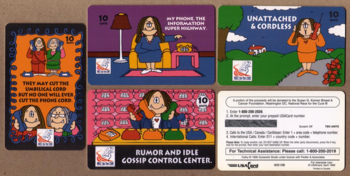 The cards combine imagery of phones and phone accessories with heart symbols to emphasize the fundraising cause. The overall presentation integrates cartoon caricatures with thematic artwork linked to breast cancer awareness and the Race for the Cure event. These collectible phone cards celebrate support, hope, and community in the fight against breast cancer.