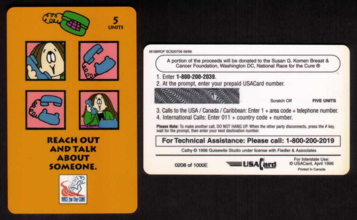 The image prominently displays symbolic elements such as telephones and phone cords, highlighting the connection through communication, fitting for a phone card. Multiple telephones and their cords are drawn in an animated, comic style, reinforcing the theme of reaching out by phone. The text “Race for the Cure” appears, tying the card to the well-known breast cancer awareness event. The card includes the name Kathy, tied to the comic breast cancer fundraiser, linking the artwork to a specific person connected to the campaign.