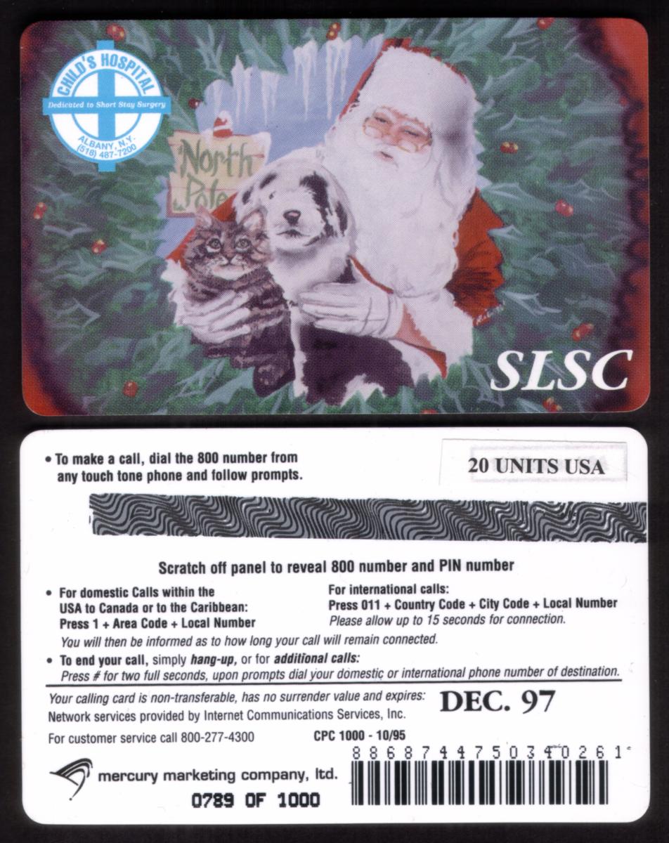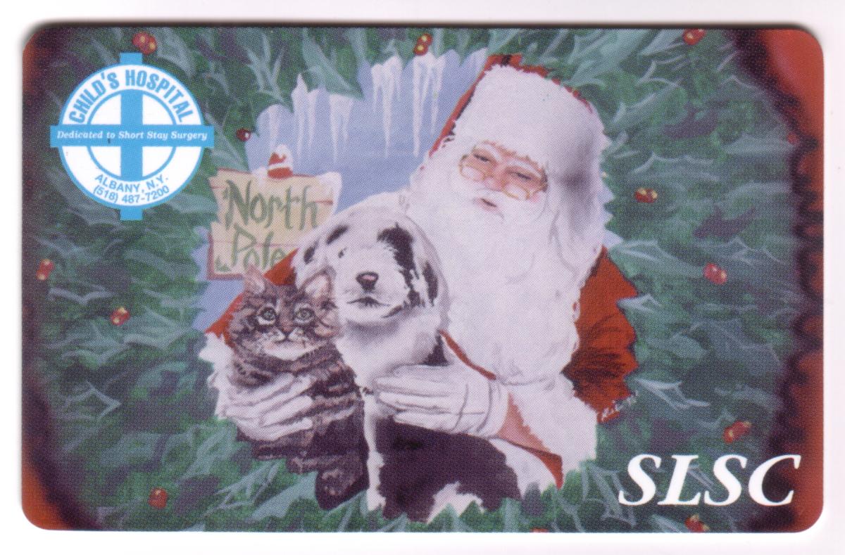 This card is dedicated to the Short Stay Surgery 20 Unit at the Child’s Hospital in Albany, New York. The combination of Christmas themes, including Santa Claus and holiday greenery, alongside the hospital dedication, highlights the card’s purpose as a commemorative or fundraising item connected to the Child’s Hospital.