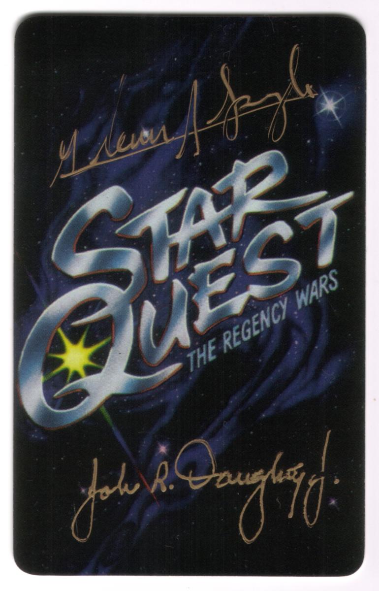 This collectible phone card features the logo for "Star Quest: The Regency Wars" prominently in the center. The text is styled with a metallic silver and light blue gradient, with the word "Quest" containing a yellow starburst within the letter Q. The background is dark, resembling outer space, with shades of deep blue and black and faint star-like points scattered throughout.
