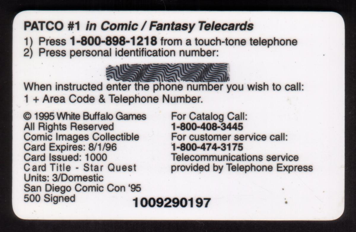 This card is associated with White Buffalo Games and PATCO, as indicated by the keywords and the style consistent with collectible fantasy art and comic-inspired phone cards. The combination of the branding, logo, and signatures makes it a sought-after item for collectors interested in fantasy art and the Star Quest series.