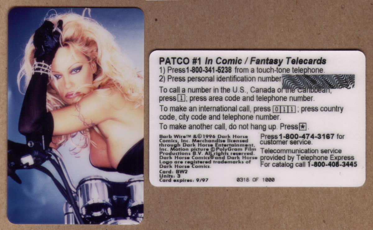 This collectible phone card features artwork from Dark Horse Comics with a focus on women, highlighting the character Pamela Anderson. The design prominently displays Pamela Anderson wearing a revealing outfit, standing beside a motorcycle. The motorcycle is detailed with chrome accents and a close-up view of its mechanical parts, emphasizing the connection to the "Barb Wire" theme.