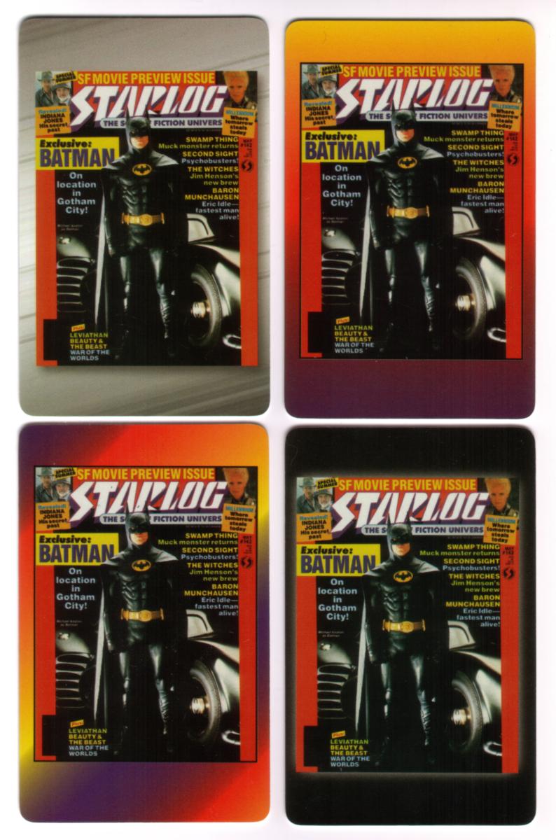 This collectible phone card set features comic art from Starlog Magazine, focusing on Batman and the Batmobile. The set includes four different cards showcasing varied gradient backgrounds, each presenting detailed fantasy and comic-style artwork. Batman is depicted prominently, clad in his classic costume, alongside the iconic Batmobile, reflecting the blend of fiction and superhero themes.