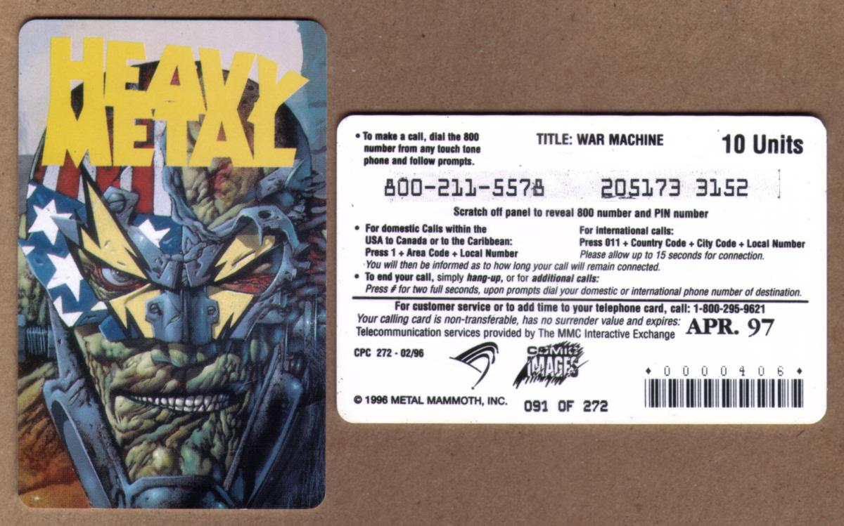 Issued by Mercury Marketing, this card is a used collectible item. It carries official branding relevant to the Heavy Metal War Machine comic images and reflects authentic imagery tied to this comic series. The front side includes only imagery and text relevant to the comic and marketing details, with no additional unrelated logos or symbols present.