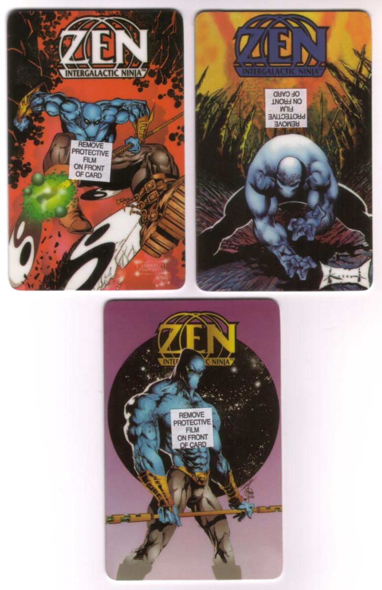 This collectible set features three cards from the 1994 Zen Comics series centered on the character Intergalactic Ninja. Each card includes detailed artwork showcasing comic and cartoon-style characters known from Zen Comics and Surge Entertainment. The images highlight dynamic poses and colorful designs representative of comic strips and animation art from that era.