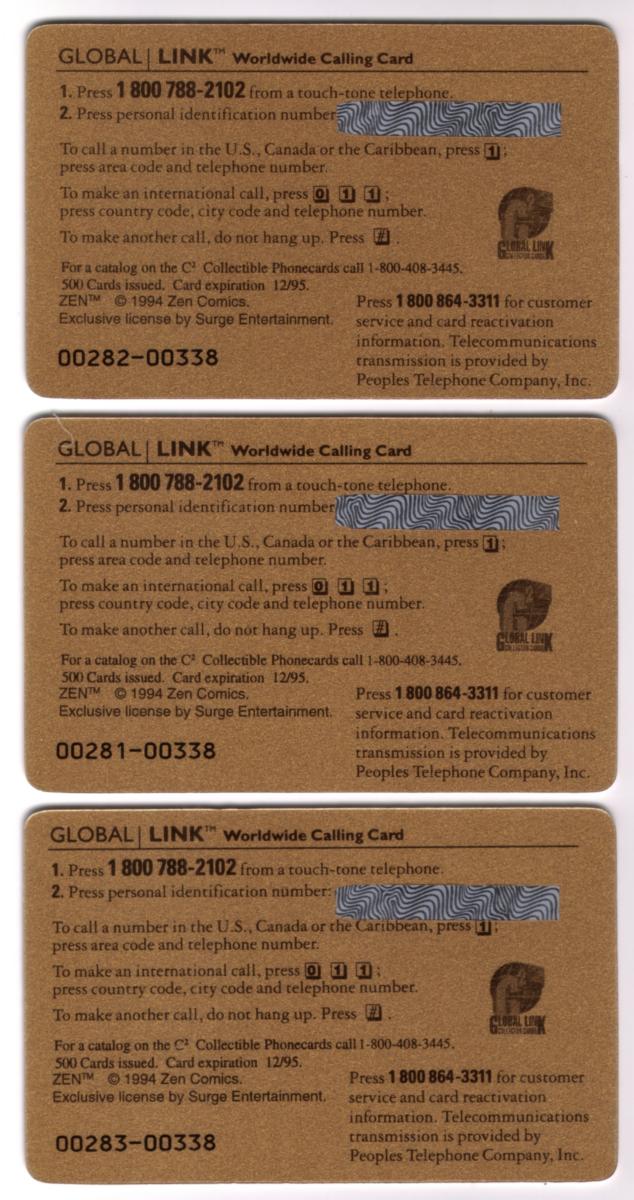 Produced under the Global Link series, these unsigned cards were never autographed or signed and belong strictly to the collectible phone card category. The cards display the Surge Entertainment and Zen Comics logos clearly, connecting the set to their 1994 release and confirming the artistic and entertainment heritage behind this collectible compilation.