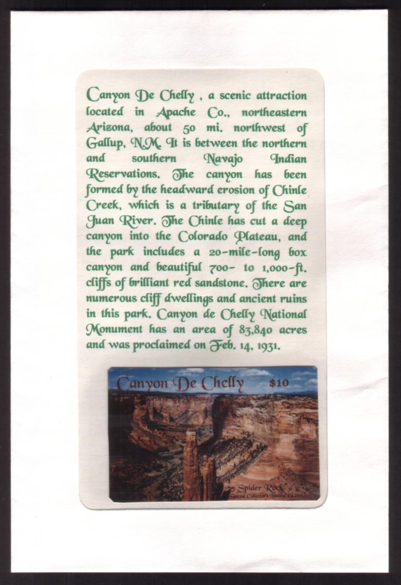 Additional elements on the card include text noting geographic and cultural details: "Chinle Creek," referring to a waterway; "Harvest Home $10," indicating the card’s value and possibly a related event or theme; and "Apache Colorado," highlighting the Apache tribe associated with this region. The card is housed in a folder produced by Premiere Communication Inc., as indicated by text on the front. The overall design emphasizes the archaeological and natural significance of Canyon De Chelly, known for its cliff dwellings and ancient ruins visible in the area.