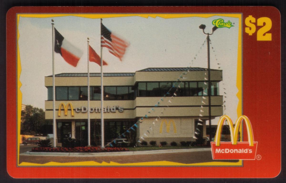 The card has a bright red border with a yellow outline framing the photo. On the bottom right corner inside the border, the McDonald's golden arches logo is shown alongside the text "McDonald's" in white letters against a red background. The card has a denomination of $2 printed in large yellow font on the top right corner.
