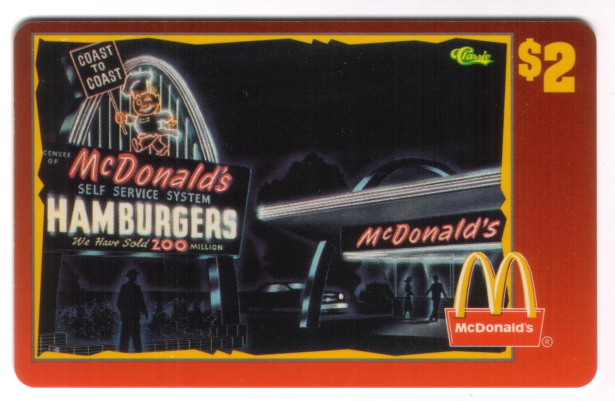 The card has a border in shades of orange and red, with a yellow "$2" printed in the upper right corner. In the bottom right corner, there is the well-known Golden Arches logo above a red banner that reads "McDonald's." The Classic logo appears in the upper right of the image area.