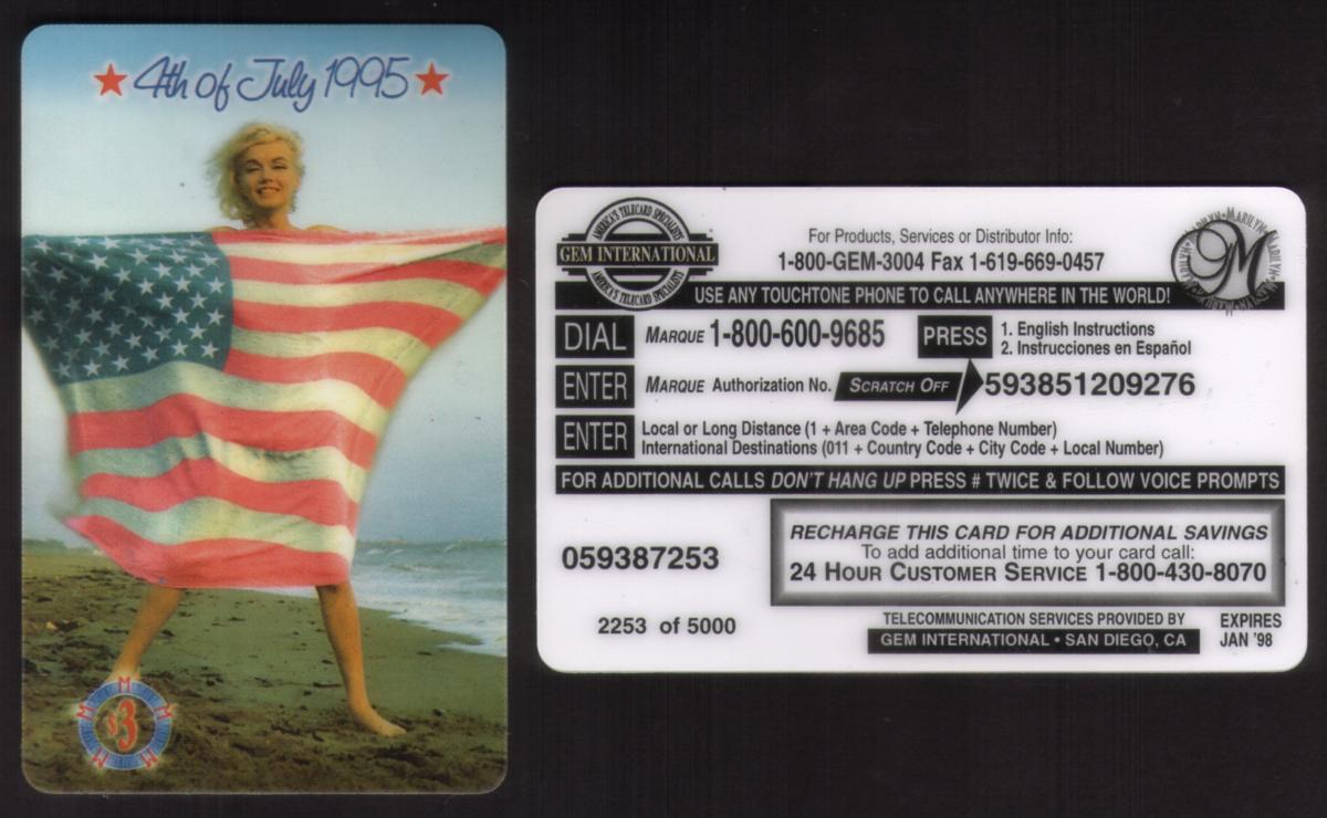 Produced by GEM International, this card is marked as "USED" and carries a $3 denomination. The overall presentation celebrates Marilyn Monroe’s legacy as a Hollywood icon while commemorating Independence Day with patriotic elements.
