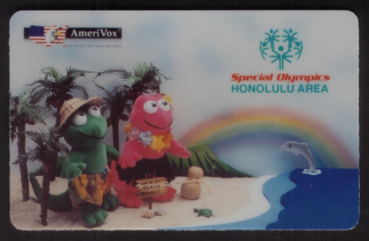 This phone card commemorates the 5th Special Olympics event in the Honolulu area and incorporates Hawaiian cultural motifs, including the protective aumakua spirit symbolized by the mo'o gecko. The artistic design combines playful cartoon characters with iconic Hawaiian imagery, emphasizing themes of good luck, nature, and celebration in a memorable souvenir collectible.