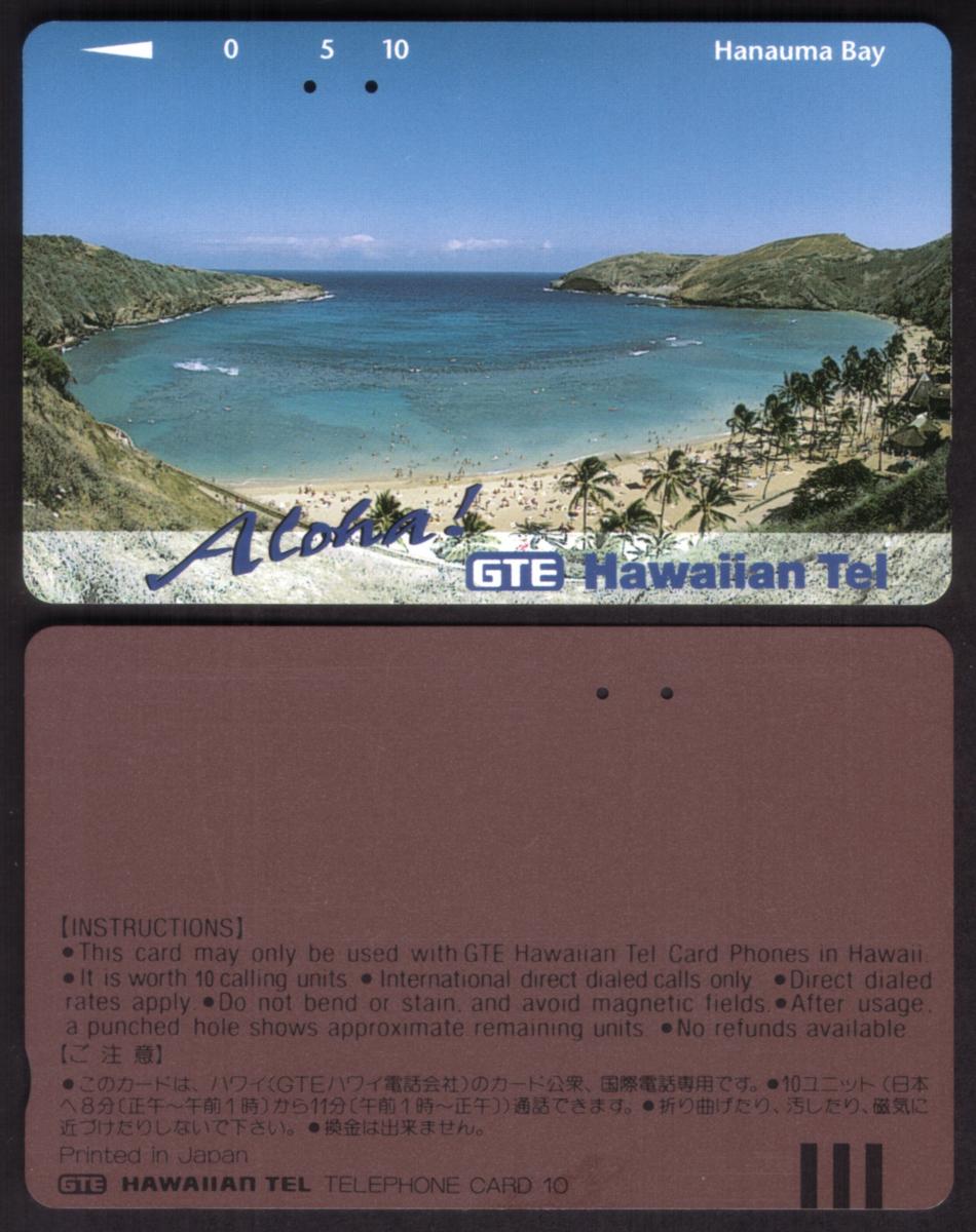 The card is associated with GTE Hawaiian Telephone and has the text "10u Hanauma Bay" prominently displayed, indicating a prepaid value of 10 units for telephone use. The word "Aloha" appears in a casual script, reinforcing the Hawaiian theme. This particular card shows signs of use, with two punch holes visible on the surface.